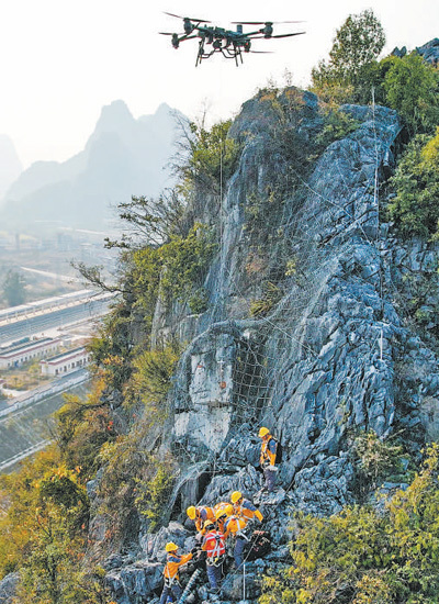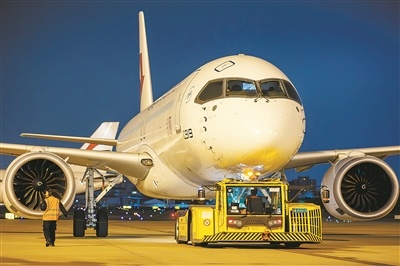 东航技术国产飞机维修部工作人员指挥牵引车将C919大飞机牵引至机库。沈文敏汪洋摄影报道