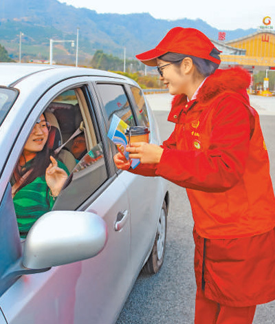 呼北高速广西梧州蒙山西高速出入口服务点,志愿者为旅客送上春节礼物。周火文摄(影像中国)