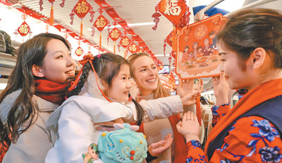 在北京西站开往郑州东站的G97次列车上,国铁郑州局工作人员组织各式“迎新春”特色活动,让乘客在旅途中感受春节的美好氛围。朱佩娴宛文鹏摄影报道